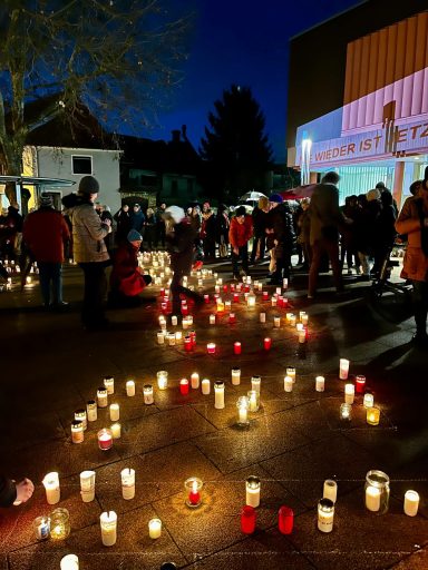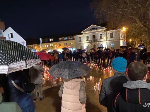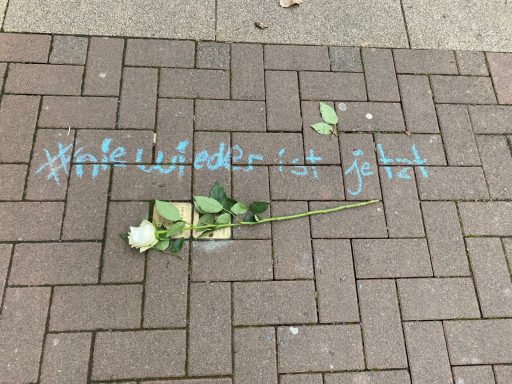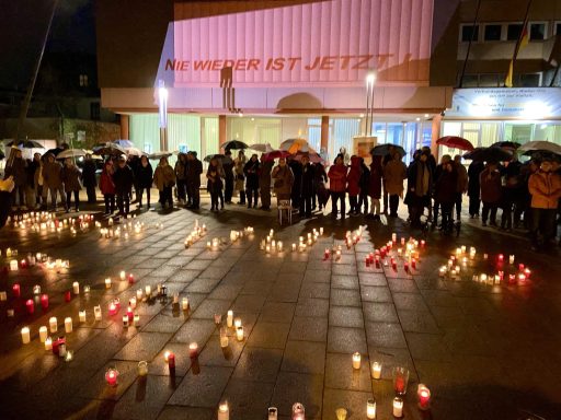 Auf Reden und Statements hatten wir seitens des Bündnisses bewusst verzichtet. Stattdessden läuteten zum Gedenken der Opfer des Holocaust um 18.00 Uhr die Kirchenglocken. Nie wieder ist jetzt! Bereits am frühen Nachmittag schauten Schüler:innen der IGS auf dem Rathausplatz vorbei, hafen beim Aufzeichnen des Schriftzuges "Nie wieder ist jetzt" und stellten eine Kerze - versehen mit persönlichen Notizen - auf. Kurz vor sechs füllte sich der Platz - ca. 200 Menschen trotzten dem schlechten Wetter und zeigten durch ihr Kommen, dass "Nie wieder" gerade im Moment bedeutet, klare Stellung zu beziehen.