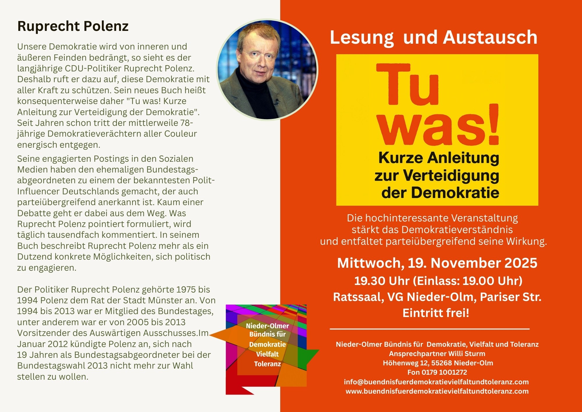 Für Ruprecht Polenz (CDU Politiker) ist klar: „In Deutschland hat man noch nie besser gelebt als jetzt, es ist uns noch nie so gut gegangen.“ Warum also ist die Stimmung so mies? Warum haben diejenigen, die immer nur das Schlechte sehen wollen, im öffentlichen Diskurs Oberwasser? Warum wird die Demokratie diskreditiert? Der ehemalige CDU-Bundestagsabgeordnete will dies jedenfalls nicht einfach so stehen lassen. Mit seinem Buch „Tu was! Kurze Anleitung zur Verteidigung der Demokratie“ will Ruprecht Polenz aufrütteln, die Menschen zum Mitmachen bewegen...