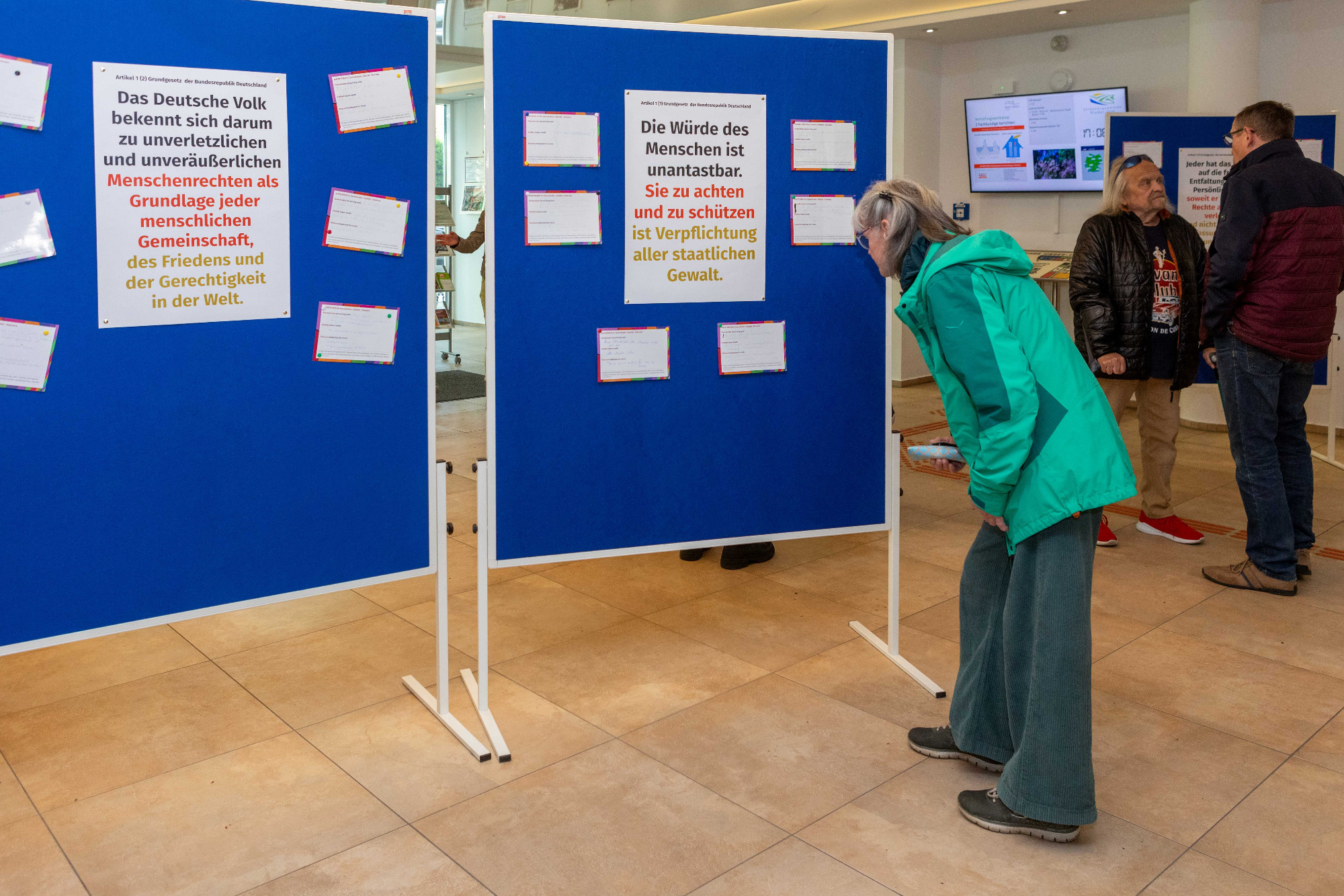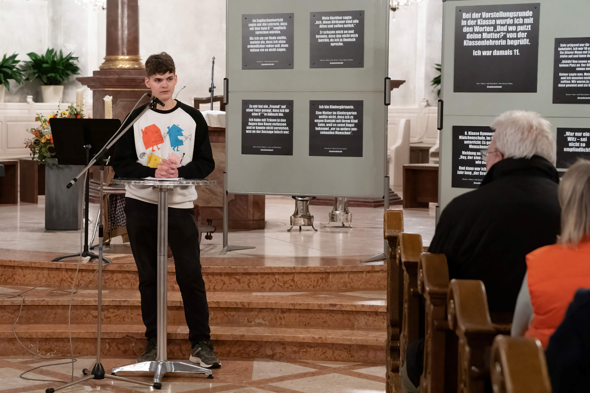 Die Initiative für das Projekt ging von der IGS aus, die als Mitglied im Schulnetzwerk „Schule ohne Rassismus“ schon seit Jahren aktiv dabei ist, das Miteinander innerhalb der Schulgemeinschaft auf den Säulen von Vielfalt und Toleranz aufzubauen – und damit dem Rassismus die Stirn zu bieten. Der jährliche schulinterne Aktionstag wird nun durch das Ausstellungsprojekt ergänzt. Das Zeichen gegen Rassismus soll so auch außerhalb der Schulwände Gehör finden. Um eine breite Öffentlichkeit auf das Projekt aufmerksam zu machen, konnte das Bündnis einige Geschäfte in der Stadtmitte als Mitstreiter gewinnen. Optik Gothe, Buchhandlung BINO, Schreinerei T2, Hippienez Boutique, Foto Seidl, TUI -Reisebüro und Eiscafe Piccin zeigten ebenfalls die Tafeln der Wanderausstellung. „Dadurch wollen wir auch Menschen erreichen, die die Ausstellung in der Kirche nicht sehen können“, sagt Willi Sturm. In der Kirche stehen zudem zeitweise Mitglieder des Bündnisses bereit, um sowohl über die Ausstellung selbst als auch über die Arbeit des Nieder-Olmer Bündnis für Demokratie, Vielfalt und Toleranz zu informieren.