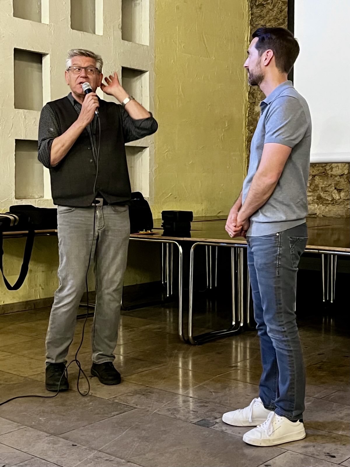 Und warum wagen immer weniger Menschen den offenen Diskurs und den Austausch von Argumenten? Wo bleibt der Respekt vor anderen Meinungen und Sichtweisen? Für das taw-Theater ist klar: „Wir müssen reden. Wir müssen die Dinge aussprechen und die Menschen ansprechen.“ Denn frei nach Arthur Schopenhauer sind wir nicht nur dafür verantwortlich was wir tun, sondern auch für das, was wir nicht tun.“ Also, zum Schluss die Aufforderung von Maasch und Schmidt an die rund 70 Gäste im Camarahaus: „Sitzen sie nicht so da, machen sie mal was. Es geht ja nicht nur um uns.“ Zum begeisterten Schlussapplaus hat es schon mal geführt.