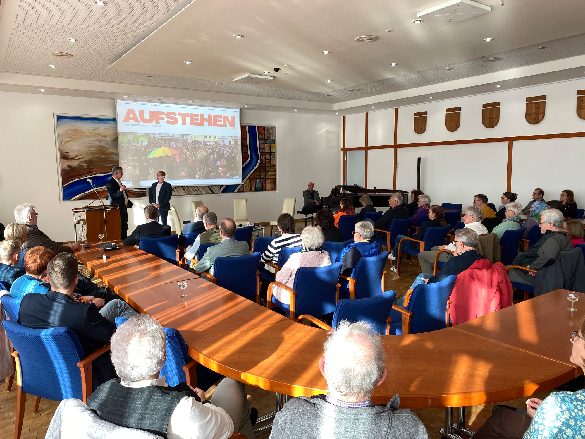 Prof. Dr. Lars Brocker, Präsident des Verfassungsgerichtes Rheinland-Pfalz war auf Einladung des Bündnisses am 26. April im Nieder-Olmer Ratsaal zu Gast. Nach dem sehr interessanten Impulsvortrag "Die Einmaligkeit unserer Verfassung - Wie kann die Demokratie geschützt werden?" kamen die zahlreich Anwesenden über die brennenden Fragen ins Gespräch und tauschten sich aus. Für viele war dieser Abend eine wirkliche Sternstunde mit neuen und interessanten Aspekten.